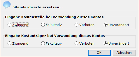Diesen Menüpunkt gibt es nur bei den Systemkonten der Fibu und kann eingestellte Werte für das Verhalten von Buchungs- bzw. Erfassungseingaben auf markierten Systemkonten-Datensätzen verändern: