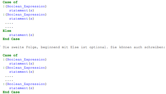Im Gegensatz zur Struktur If...Else...End if prüft die Struktur Case of...Else...End case eine unbegrenzte Anzahl von Boolean-Ausdrücken und führt bei einer wahren Bedingung eine Aktion aus.