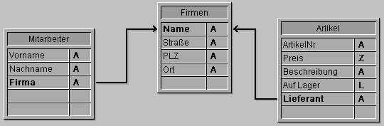 Im folgenden Beispiel sind drei Tabellen über automatische Verknüpfungen miteinander verbunden. Die beiden Tabellen [Mitarbeiter] und [Artikel] haben eine Viele-Zu-Eine Verknüpfung zur Tabelle [Firmen].