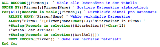 Folgende Methode durchläuft jeden Datensatz der Tabelle [Firmen] und zeigt für jede Firma eine Meldung an. Sie zeigt die Anzahl der Angestellten in der Firma (die Anzahl der verknüpften Datensätze aus [Mitarbeiter]) sowie die Anzahl der Artikel (die Anzahl der verknüpften Datensätze aus [Artikel]. Im Beispiel wird das Argument zum Befehl ALERT zur besseren Übersicht in mehreren Zeilen angezeigt. Beachten Sie, dass der Befehl RELATE MANY auch bei automatischen Verknüpfungen benötigt wird.