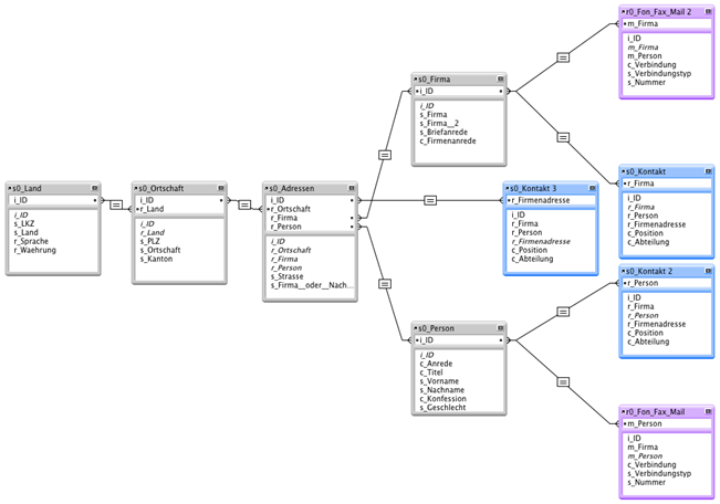 Soll eine Information, die auf einer anderen Tabelle liegt, geladen werden, muss die Verbindung zwischen den Tabellen hergestellt werden. Die Darstellung zeigt die Verbindung der verschiedenen Tabellen bei der Adresse: