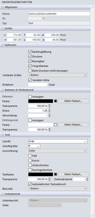 Sonst sind in dieser Maske die bekannten Formatierungen möglich, wie Veränderungen an Schriftart, Schriftgrösse, Ausrichtung, etc. Auf dem Objekt selber lassen sich noch andere Einstellungen vornehmen, etwa die Formatierung der Zahl (wie viele Nullen sollen nach dem Komma gedruckt werden).