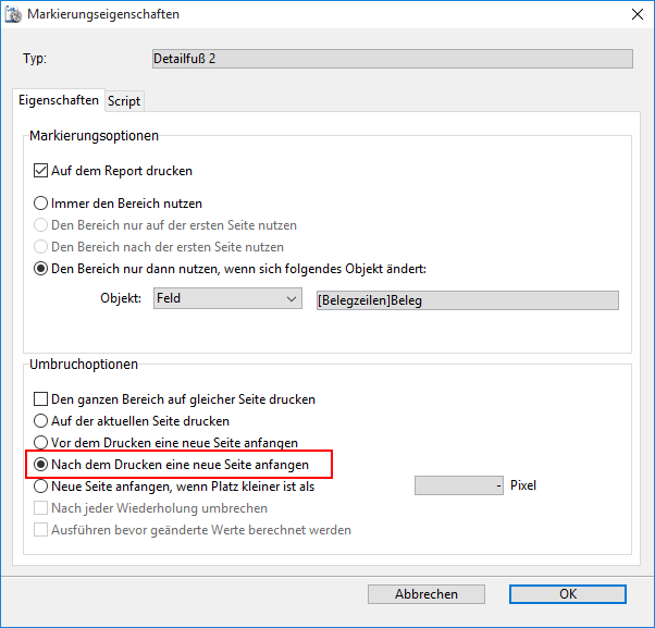 - Bei den Eigenschaften im Detailfuss 2 folgende Einstellung vornehmen: "Nach dem Drucken eine neue Seite anfangen"