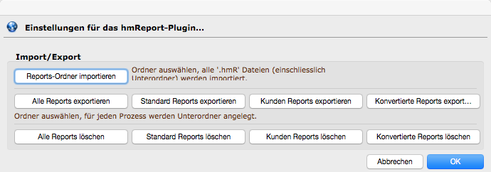 - "Report-Ordner importieren" (neue Standard-hmReports). Die importierten neuen Reports werden den noch bestehenden Kundenreports angehängt.