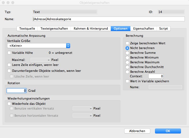 - In den Optionen des Objektes (im Detail) wird die Checkbox "Zeige berechneten Wert" und der Radiobutton "Berechne Summe" gesetzt.