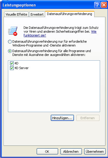 In Windows XP und Vista gibt es die sog. Windows DEP Data Execution Prevention. Diese Methode trägt zum Schutz vor Viren und andern Angriffen bei. Es kann sein, dass diese Einstellung auf einem Server oder einem Client standardmässig für Windows-Programme und -Dienste aktiviert ist. Somit ist die Ausführungsverhinderung zu entfernen für 4D.exe und 4D Server.exe.