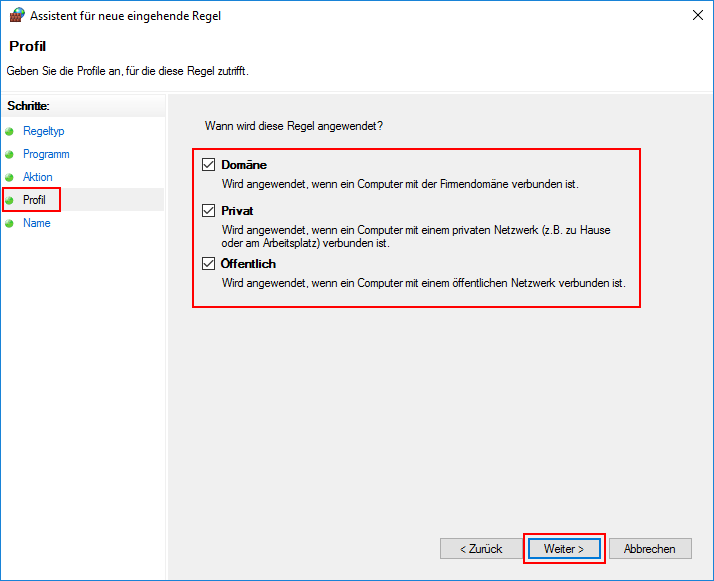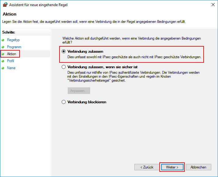 Unter Windows Server 2012 R2 müssen die ein- und ausgehenden Regeln neu festgelegt werden: