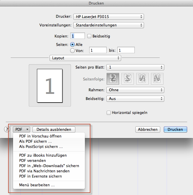 Drucken unter Mac Unter Mac können beim Aufruf des Druck-Parameters die standardmässig (lokalen) vorhandenen Einstellungen genutzt werden: Beachten Sie bitte die Ausführungen unter "Drucken".
