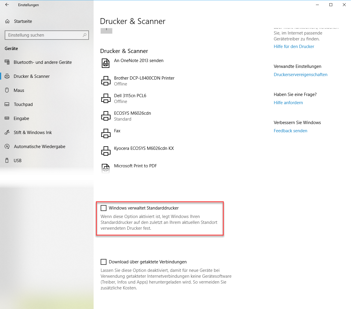 Verhindern Sie auf Ihrer Workstation, dass Windows den Standarddrucker verwaltet. Falls die Checkbox gestellt wäre, übersteuert diese Einstellung die Druckeinstellungen im hmR.