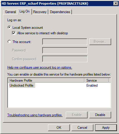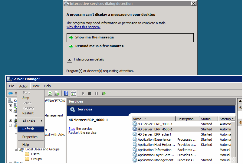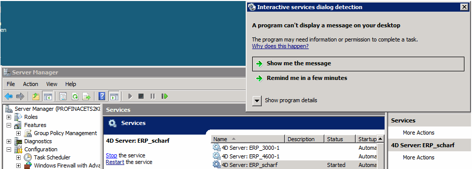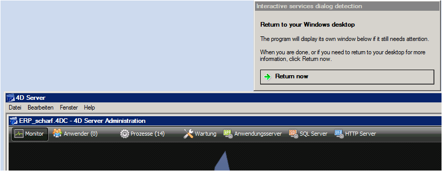 Wenn Sie einen 4D Server unter einem Windows-2008-64-Bit-Betriebssystem als Dienst registrieren und diesen Dienst starten, wird er ohne Konsole/Oberfläche versteckt im Hintergrund als interaktiver Prozess ausgeführt. Der Hinweis im 4D-Server-Handbuch lautet wie folgt: