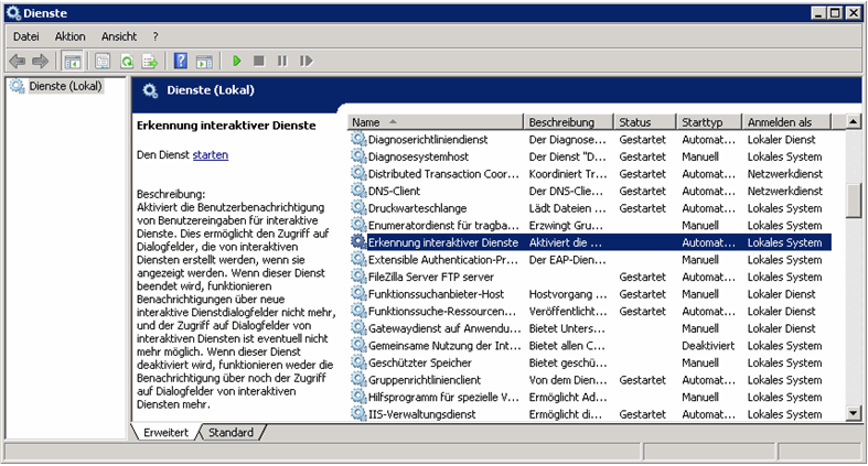 Unter Server 2008 (und unter Windows 7) werden die Dienste in den Hintergrund „verschoben“, das heisst, dass die 4D-Konsole von bossERP auf dem Server nicht sichtbar ist. Damit die Interaktiven Prozesse trotzdem angezeigt werden, muss der entsprechende Dienst aktiviert sein: Interactive Services Detection / Erkennung interaktiver Dienste.