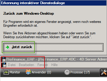 Loggt man sich auf einen Server 2008 ein, so sind die interaktiven Dienste nach einer gewissen Zeit auf der Taskleiste als Button erkennbar. Man kann darauf klicken und gelangt so in die Umgebung, in welcher die 4D-Server-Konsole angezeigt wird.