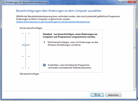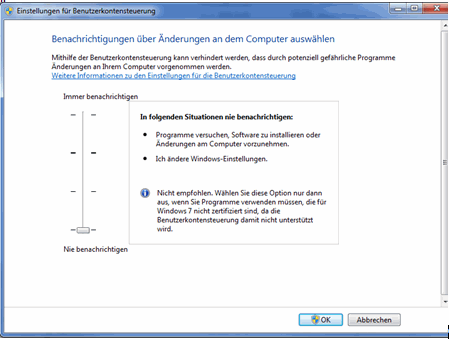 Die Betriebssysteme Server 2008 bzw. Vista und Windows 7 fragen ab, ob das Programm ausgeführt werden soll oder nicht. Diese Abfrage kann in der Benutzerkontensteuerung generell ausgeschaltet werden. Dies ist insbesondere unter Server-Bedingungen (aus der Sicht von bossinfo.com) empfehlenswert, weil auf Server grundsätzlich nur Administratoren Zugriff haben. Sehen die betrieblichen Sicherheitsrichtlinien vor, dass dies nicht gestattet ist, dann muss bossERP oder Lohn zwingend gemäss Variante 1 gestartet werden.