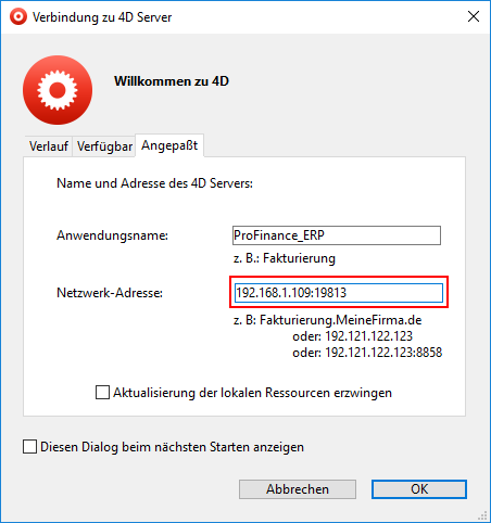 - Anschliessend startet man den zweiten Client auf der gleichen Workstation, provoziert aber beim Starten die Anmeldung mit gedrückter ALT-Taste derart, dass man die TCP/IP-Adresse des Servers (z.B. 192.168.1.109:19813) eingibt: