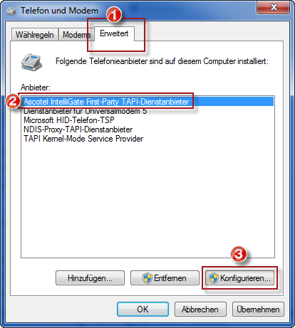 - einerseits die Einstellungen unter TAPI-Schnittstelle unter Windows (Erste Schritte)