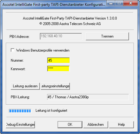 Ist die Verbindung korrekt, wird dies mittels "Leitung ist konfiguriert" angezeigt.