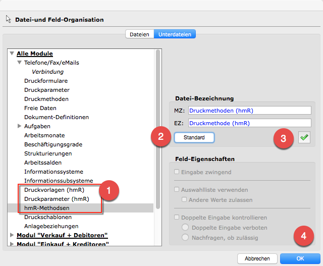 In Datenfiles, in denen die Unterdateien "hmR-Reporten" oder hmR-Parameteren" bzw. "hmR-Methodsen" falsch bezeichnet sind, sollen diese in der Datei- und Feld-Organisation, Register "Unterdateien" korrigiert werden, indem