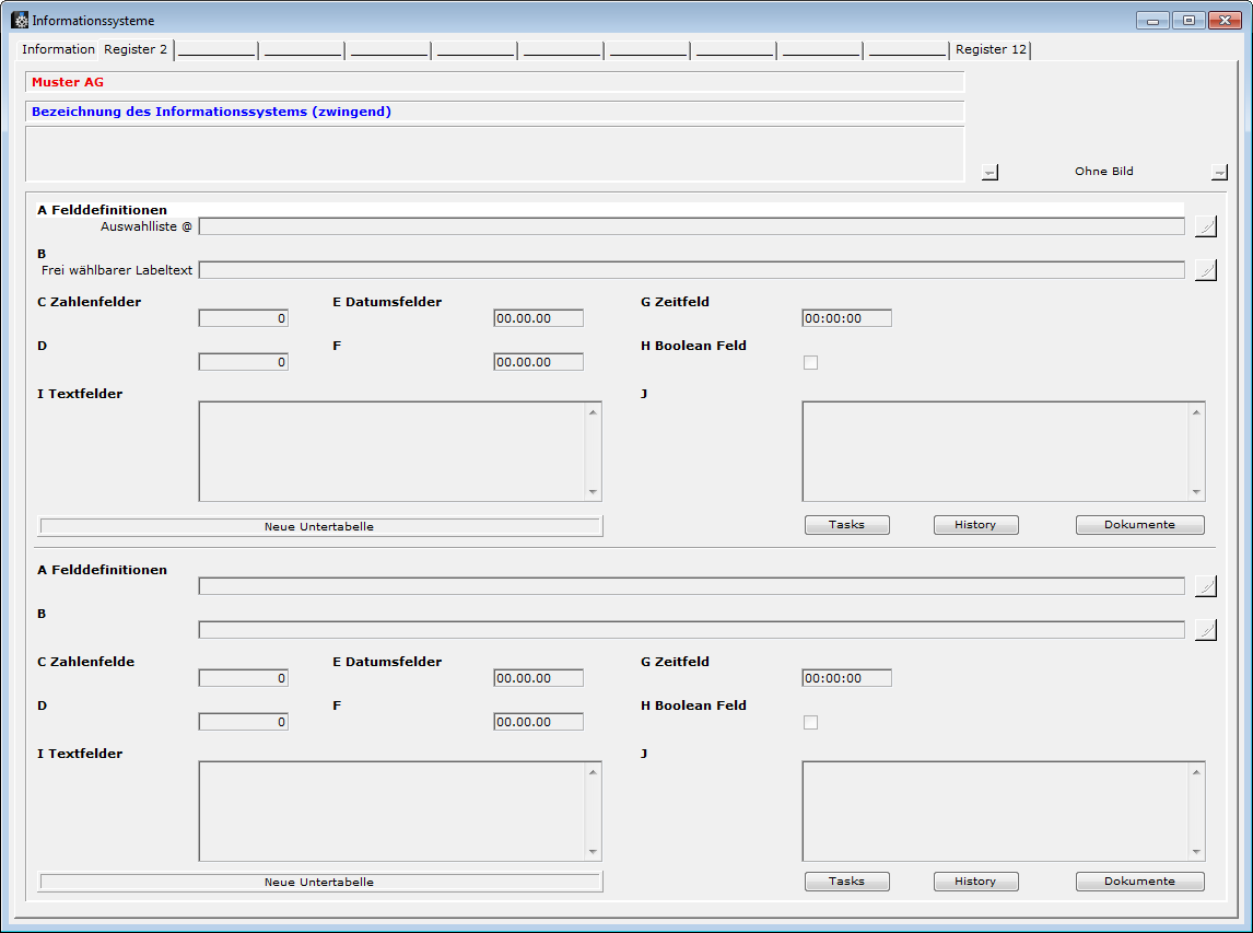 | Titel / Bezeichnung | Zwingende Bezeichnung des Info-Systems (z.B. Personal-Info-System etc.) im ersten Register. Sie erscheint in blauer Schrift. | ||