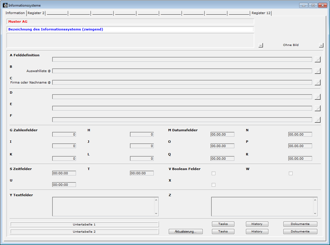 | Titel / Bezeichnung | Zwingende Bezeichnung des Info-Systems (z.B. Personal-Info-System etc.) im ersten Register . Sie erscheint in blauer Schrift. | ||