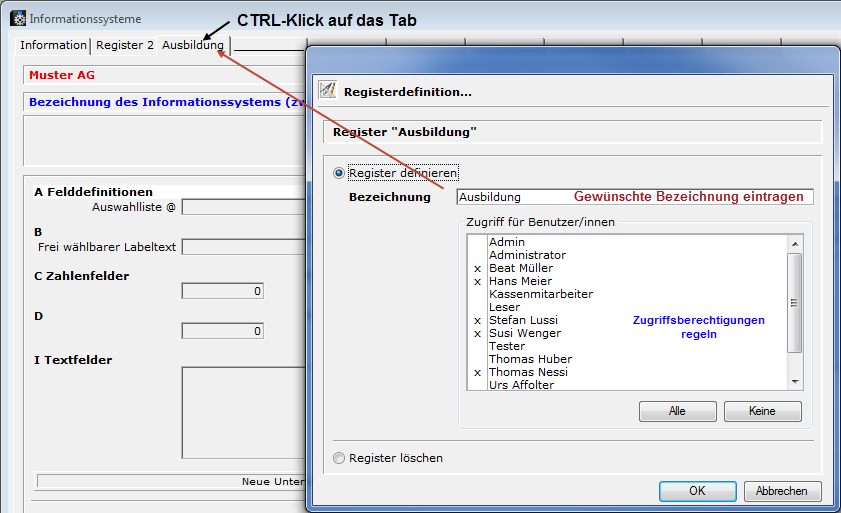 Tab-/Register-Beschriftung + Zugriffsrechte