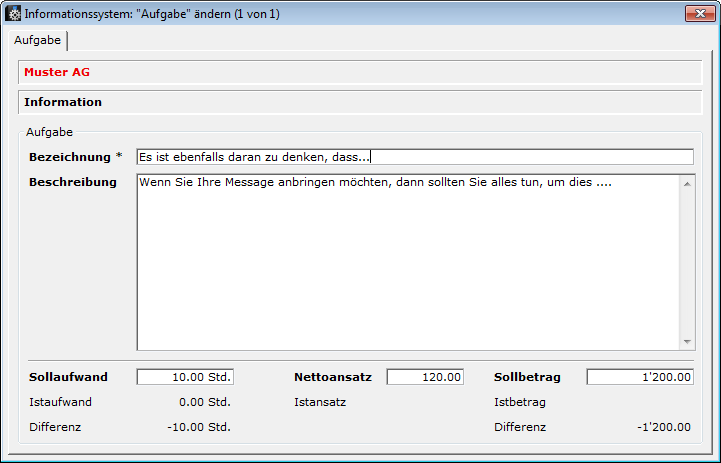 Es sind die gleichen Informationen eingebbar, wie wir sie im Register Aufgaben des Auftragsdossiers kennen bzw. hier beschrieben sind: