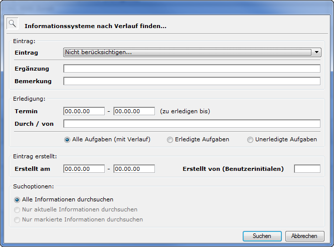 Mit dieser Suche ist es möglich, nach einzelnen Einträgen oder Kombinationen davon und/oder pendente, zu erledigende Aufgaben einer bestimmten Person eines bestimmten Zeitraumes zu finden.