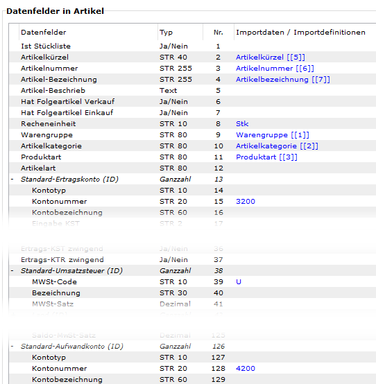 Warengruppe Artikelkategorie Produktart Artikelgruppe Artikelkürzel Artikelnummer Artikelbezeichnung EKP/Stk EUR ESP Mwst Einkauf VP CHF/Stk ab 10 Basispreis 1 VP CHF/Stk ab 1 BP Abw 1 zu 10 Mwst Verkauf Art-LP Artikel-Lieferant Standardlieferant Aufwand Ertrag Bestandesgeführt Minusbestand zulassen Artikelgruppe Verkauf ID Artikelgruppe