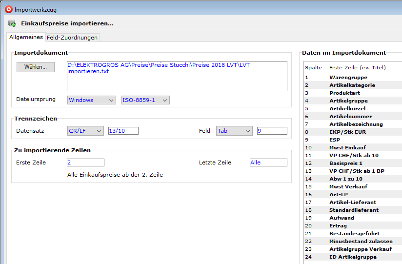 - Der Import von Einkaufspreisen setzt eine importfähige .txt-Datei voraus.