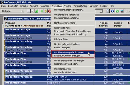 Wie bei den Belegen und Bestellbelegen gibt es bei den Planungen ebenfalls einen entsprechenden Menüpunkt Produktion - Mit fehlenden Lagerlaufnummern/Chargennummern.