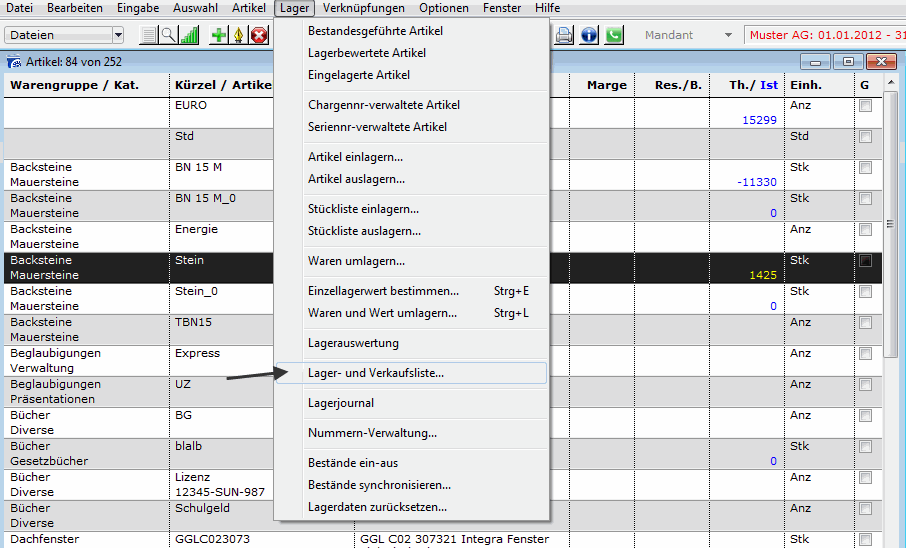 Hat man die Artikel im Output, so gibt es unter dem Menu Lager ein Item Lager- und Verkaufsliste.