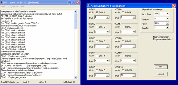 Programm installieren mit CD BHTtransfer. Folgende Einstellungen sind zu machen unter Konfiguration Schnittstellen: BaudRate: 38400 Databits: 8 Parity: None Stop Bits:1