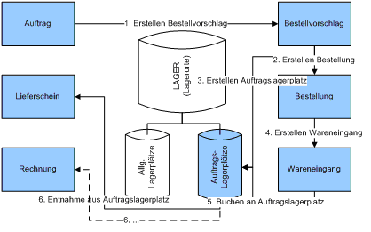 - Gleichzeitig werden im auftragsbezogenen Lagerplatz die Reservierten und bestellten Bestände nachgeführt.