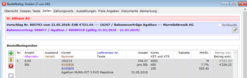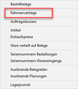 Hat es für Artikel einen gültigen Rahmenvertrag (Einkauf), werden die erzeugten Bestellvorschläge diesem Rahmenvertrag zugeordnet. Eine Rahmenvertragsbestellung beinhaltet nur Artikel, welche zum Rahmenvertrag gehören.