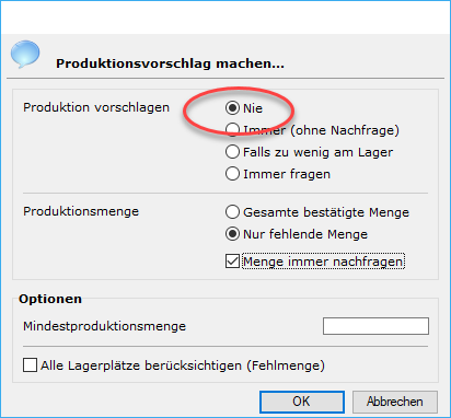 Will man Nachfragen zulassen, aber nicht x-Mal wiederholt dieselbe Frage beantworten, kamm man in den Dialogen nicht nur "Ja" oder "Nein" für eine bestimme Planzeile wählen, sondern auch "Ja für alle" und "Nein für alle" für alle gerade getesteten Material-Planzeilen und alle nachfolgenden gleichartigen Problemzeilen. Dasselbe gilt auch für nicht bestandesgeführte Artikel. Der Bestellvorschlagsprozess aus der Plan-Inputmaske läuft mit insgesamt drei Nachfragen ab.