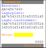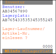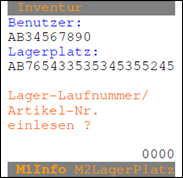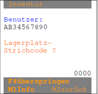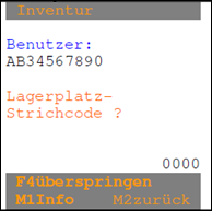 Taste 3 drücken um den Inventur-Prozess zu starten. Nun kann der Strichcode des Lagerplatzes der Artikel abgeschossen werden, welcher inventiert werden soll.