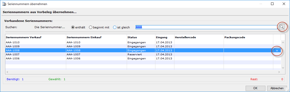 - Hat man die Seriennummer mit dem Radiobutton „ist gleich“ gesucht (z.B. beim Einlesen mit einem Scanner), wird die gefundene Zeile markiert und gleichzeitig das Auswahl-„x“ gesetzt.