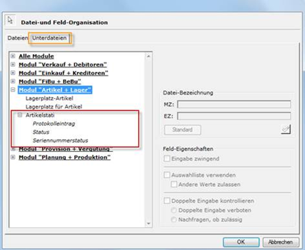 Unter Optionen - Administration - Datei- und Feldorganisation kann im Register Unterdateien darauf zugegriffen werden. Es handelt sich bei dieser Untertabelle um die eigentliche History des Gegenstandes, welcher mit der Seriennummer und diese wiederum mit dem ERP-Artikel verknüpft ist. Die History - also die Geschichte des Gegenstandes - stellt der in ERP hinterlegte "Werdegang" oder der eigentliche prozessmässige Ablauf (z.B. Bestellt, Eingelagert, Fakturiert, Eingestampft) dar. Solche Historiesin den Seriennummern, welche in der Untertabelle Artikelstati gehalten werden, können aus