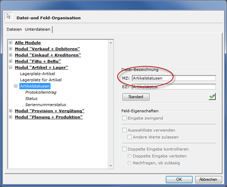 Falls das Wort „Artikelstatusen“ als Mehrzahl von „Artikelstatus“ stört und man eher „Artikelstati“ bevorzugt, kann das hier im Feld MZ geändert werden: