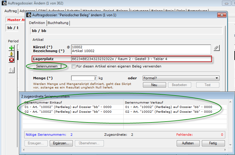 Mit dem Button „Lager/Nummer“ (grün) kann man die Seriennummer zuweisen, welche „periodisch“ verwendet werden sollen. Es können hier keine neuen Seriennummern erzeugt werden (d.h. sie müssen vorher am gewählten Lagerplatz existieren). Damit ist der "Artikel für periodische Belege reserviert".