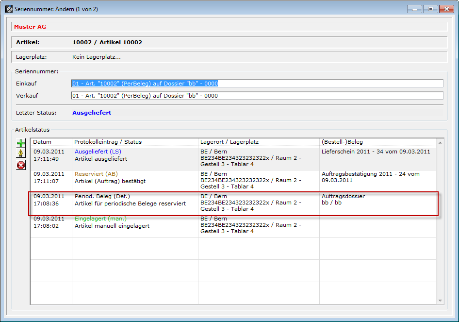 - Zuerst (von unten nach oben gelesen) wurde die Seriennummer für den Artikel „10002“ manuell in Lagerort und Lagerplatz BE / Bern eingelagert.