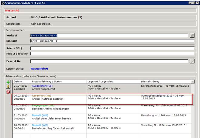 - Der Stand der Seriennummer richtet sich nach dem letzten Stand des Artikelstatus (History der Seriennummer).