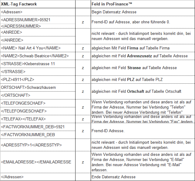 - Ist die Adresse nicht in bossERP vorhanden, so soll diese eröffnet und anschliessend durch den Benutzer ergänzt werden. Das XML sieht wie folgt aus: <?xml version="1.0" encoding="iso8859-1"?> <e3000_Adressen> <Adressen> <ADRESSNUMMER>05918</ADRESSNUMMER> <ANREDE></ANREDE> <NAME>Holzer Werner</NAME> <NAME2></NAME2> <STRASSE>Les Coldes</STRASSE> <PLZ>31350</PLZ> <ORTSCHAFT>Mondihan</ORTSCHAFT> <TELEFONGESCHAEF></TELEFONGESCHAEF> <TELEFAX></TELEFAX> <FACTWORKNUMMER_DEB>5918</FACTWORKNUMMER_DEB> <ADRESSTYP>1</ADRESSTYP> <EMAILADRESSE></EMAILADRESSE> </Adressen>