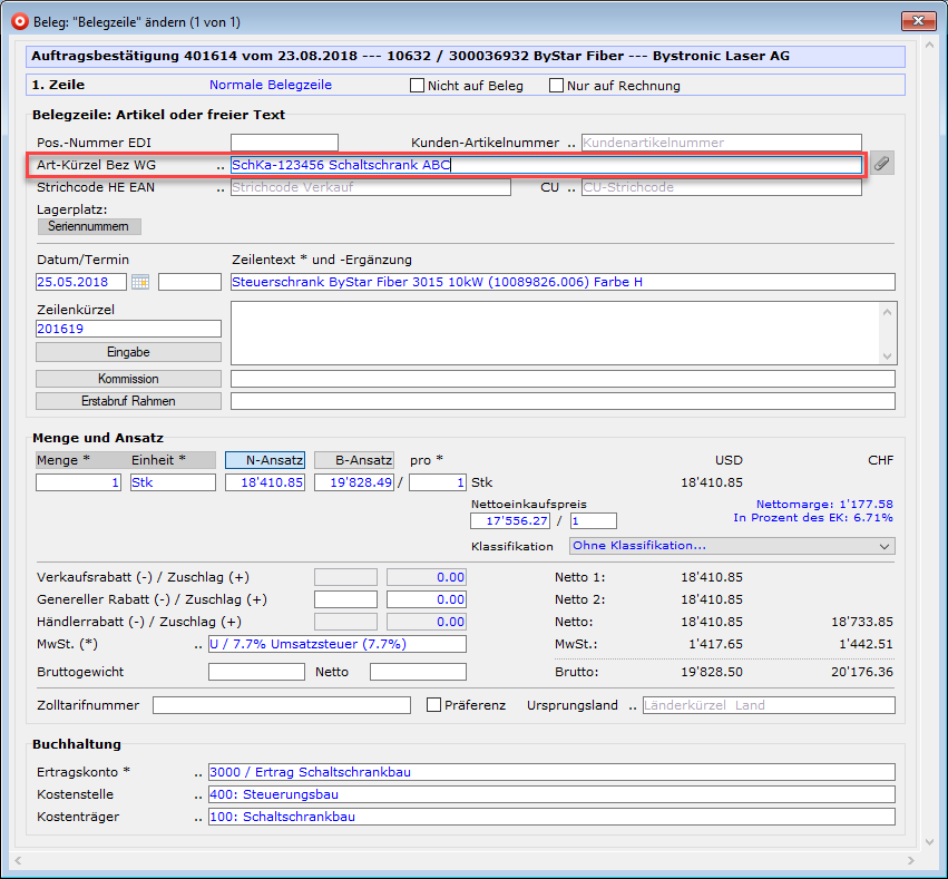 Wird ins Feldes "Art-Kürzel Bez WG" als erstes Zeichen ein "<" eingetragen, wird das Kürzel aus dem Numerator und die Artikelbezeichnung aus dem Belegzeilentext geholt; als erstes Zeichen ein "> " gefolgt von einem Leerzeichen und anschliessend "Irgend ein Text" eingetragen, holt bossERP das Kürzel aus dem Numerator und die Artikelbezeichnung wird "Irgend ein Text" gesetzt.