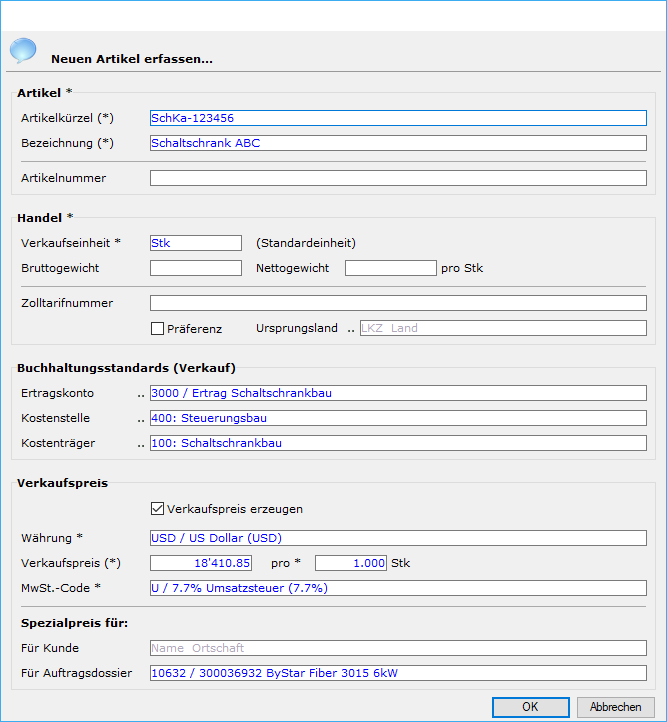 Bei Folgeaufträgen desselben Kunden, für welche dieser Verkaufspreis gelten soll, erstellt man ganz normal eine Offerte bzw. eine Auftragsbestätigung für dasselbe Auftragsdossier und für den derart erzeugten Artikel. In diesem Fall wird der angelegte Dossierspezialpreis gezogen.