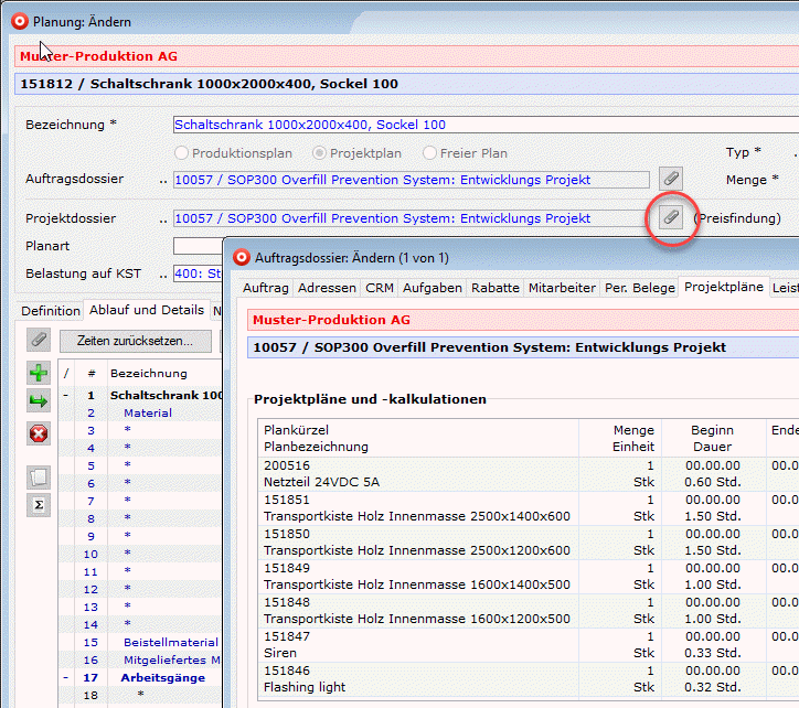 Ein Klick auf den Button rechts neben der Auftragsdossier-Bezeichnung öffnet automatisch das Auftragsdossier, Register Projektierung: