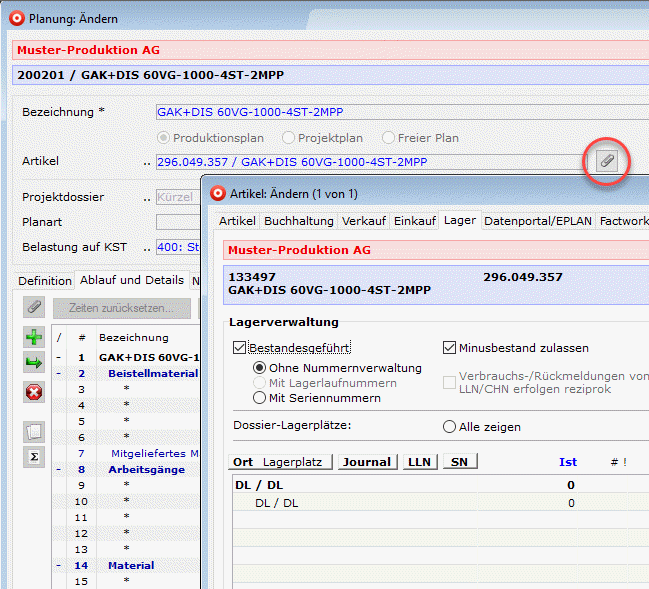 Ein Klick auf den Button rechts neben der Artikel-Bezeichnung öffnet automatisch den Artikeldatensatz: