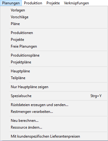 Spezielle Verknüpfungen für den Menüpunkt Planungen