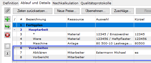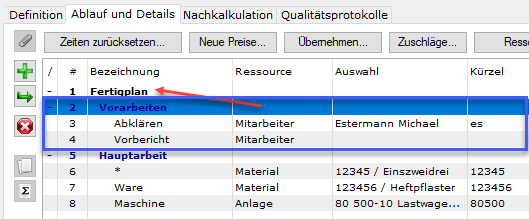 Es können Strukturzeilen markiert (wie hier die Strukturzeile 2 mit den beiden Ressourcenzeilen 3 und 4)