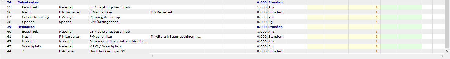 Bei den Zeilen mit F-Mechaniker sind Spezifikationen (Tätigkeiten) vorgesehen. Speziell ist, dass für die Mittagsentschädigung nicht die Spesenart, sondern die „Tätigkeit“ SPM/Mittagessen eingesetzt ist, weil das für die Rückmeldung einfacher im Handling ist.