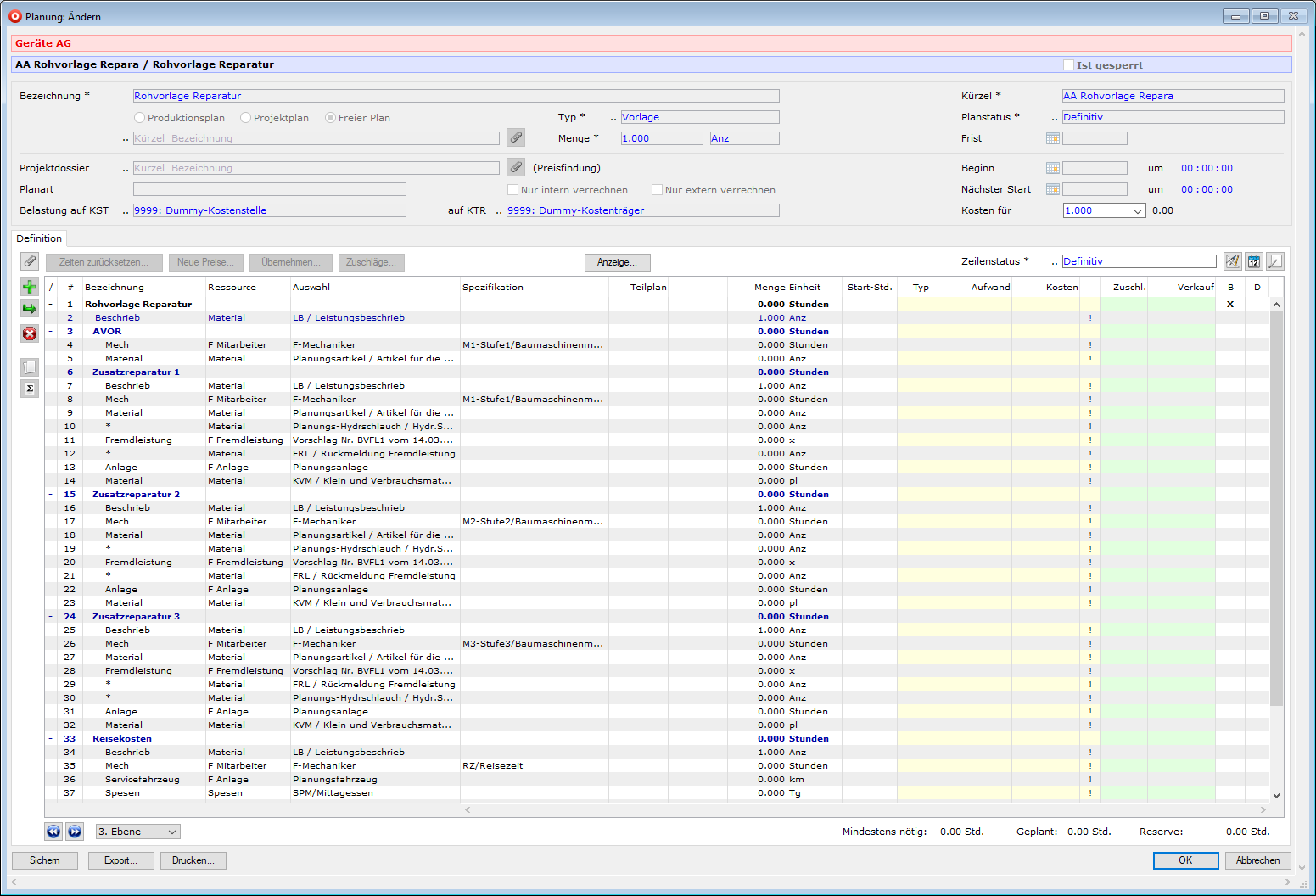 Zum Beispiel Gliederung in Arbeitsgebiete „AVOR“, „Service“, „Zusatzreparatur 1, 2, 3“, „Reisekosten“, „Reinigung“.